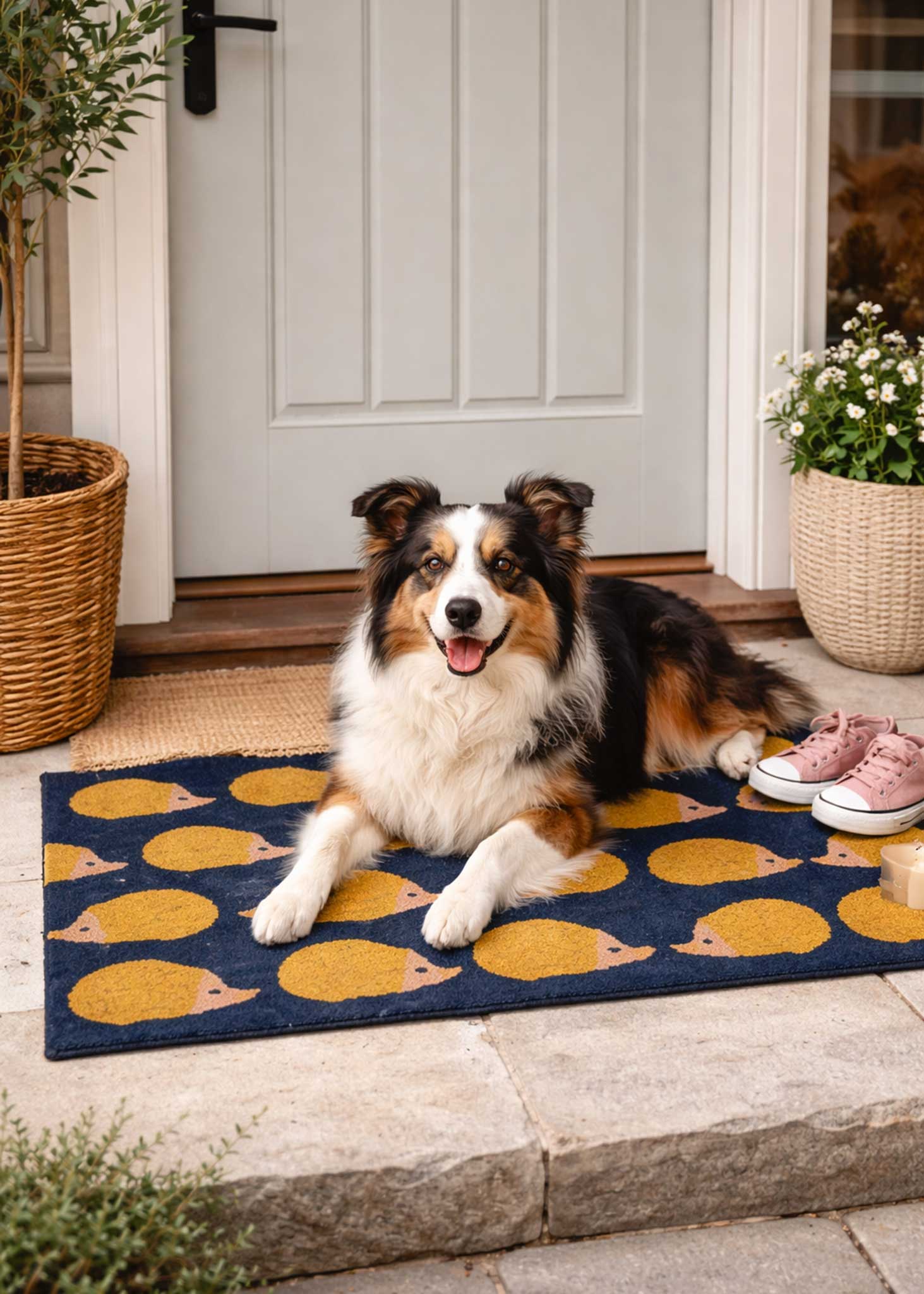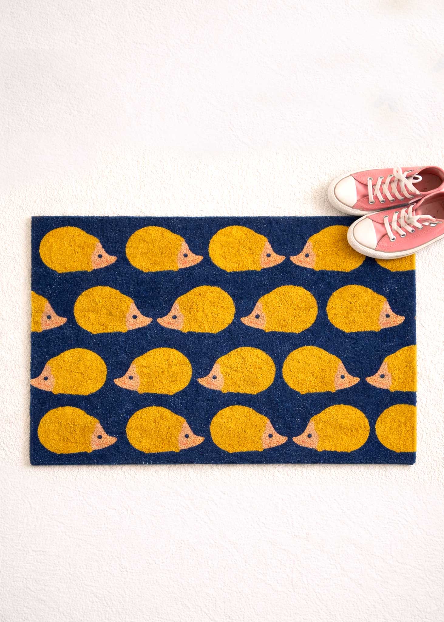 The joy of arriving home. Made even more joyful by the presence of our Kissing Hedgehogs on your doorstep. Doormats feature bold yellow hedgehog pattern, printed onto a sophisticated dark blue background. Made from high quality, 100% coconut coir, our door mats have a robust PVC backing making them incredibly long-lasting.