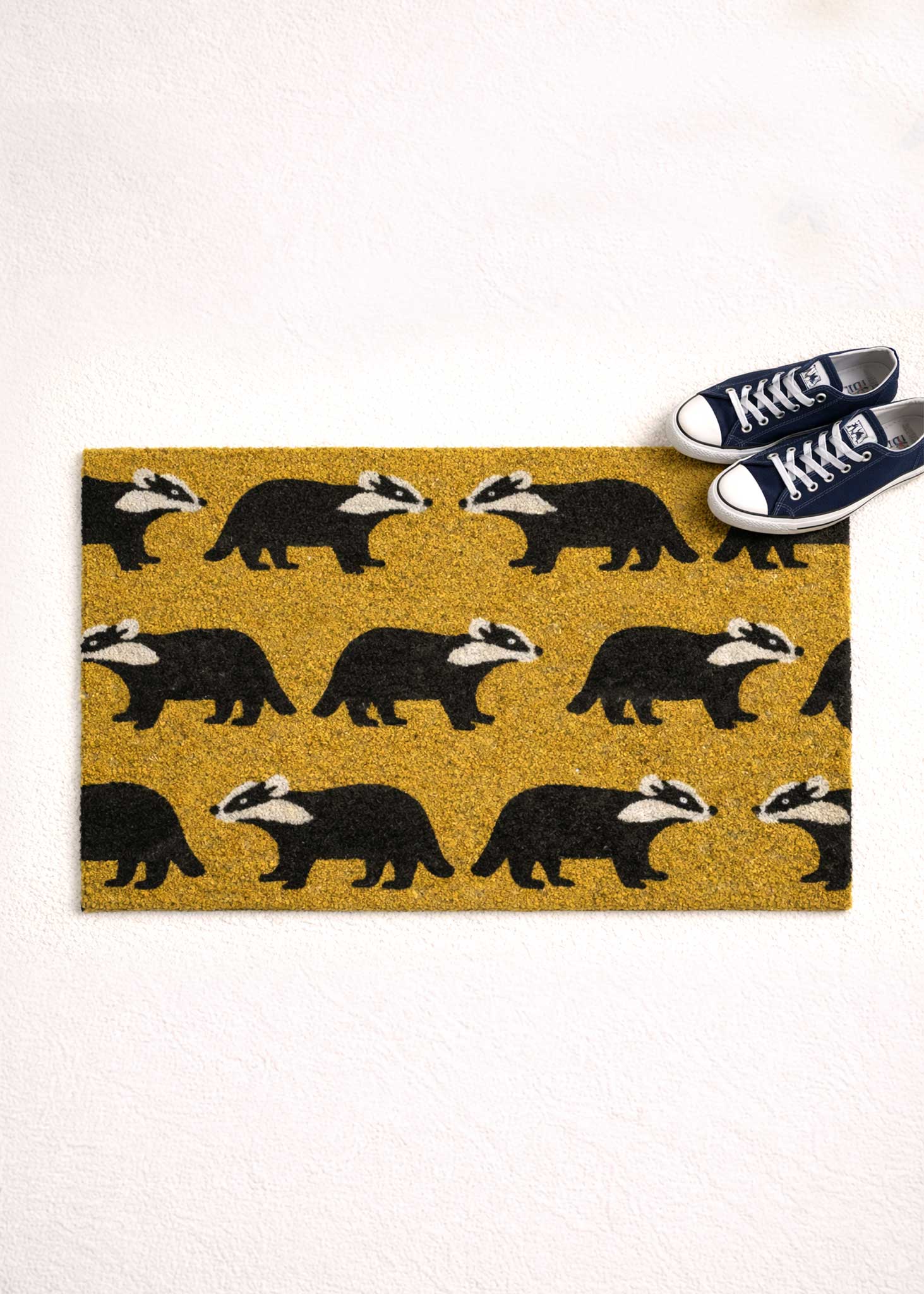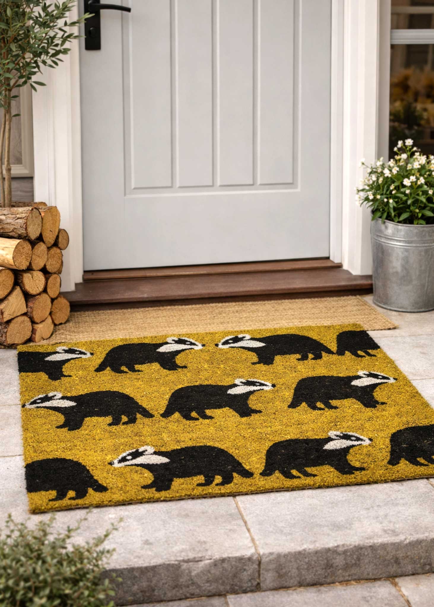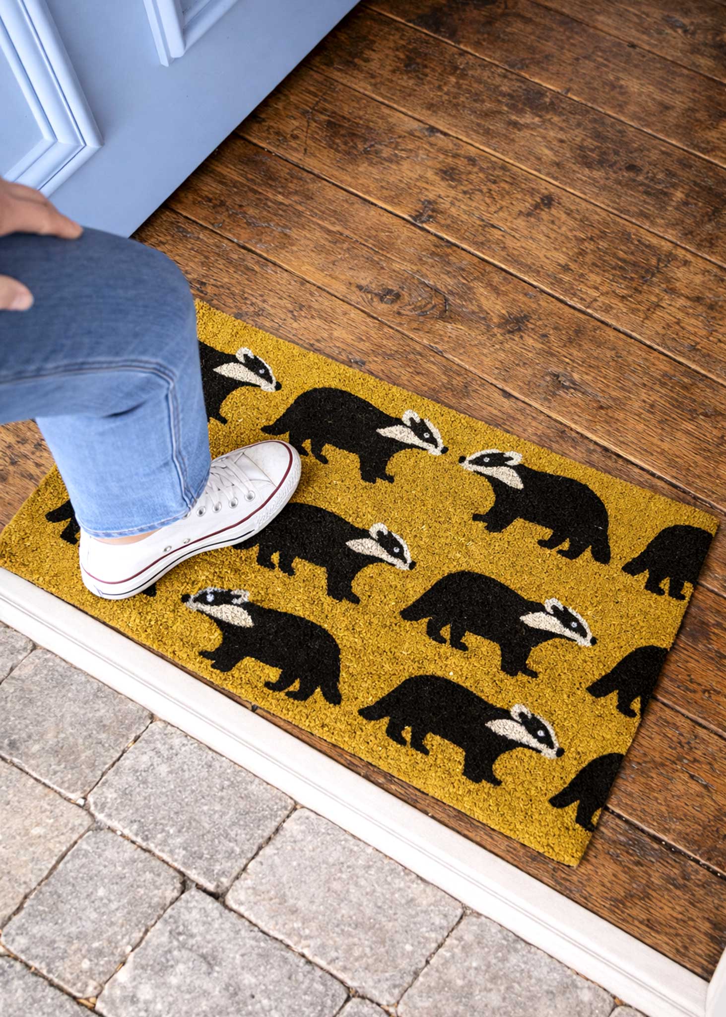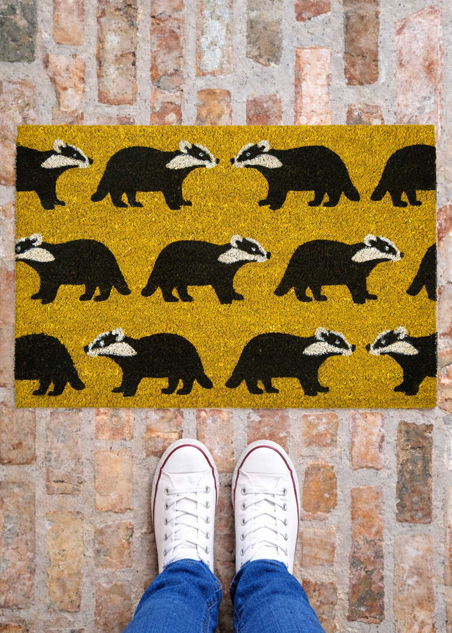 The joy of arriving home. Made even more joyful by the presence of our Kissing Badgers on your doorstep. Doormats feature bold yellow badger pattern, printed onto a stylish mustard yellow background. Made from high quality, 100% coconut coir, our door mats have a robust PVC backing making them incredibly long-lasting.