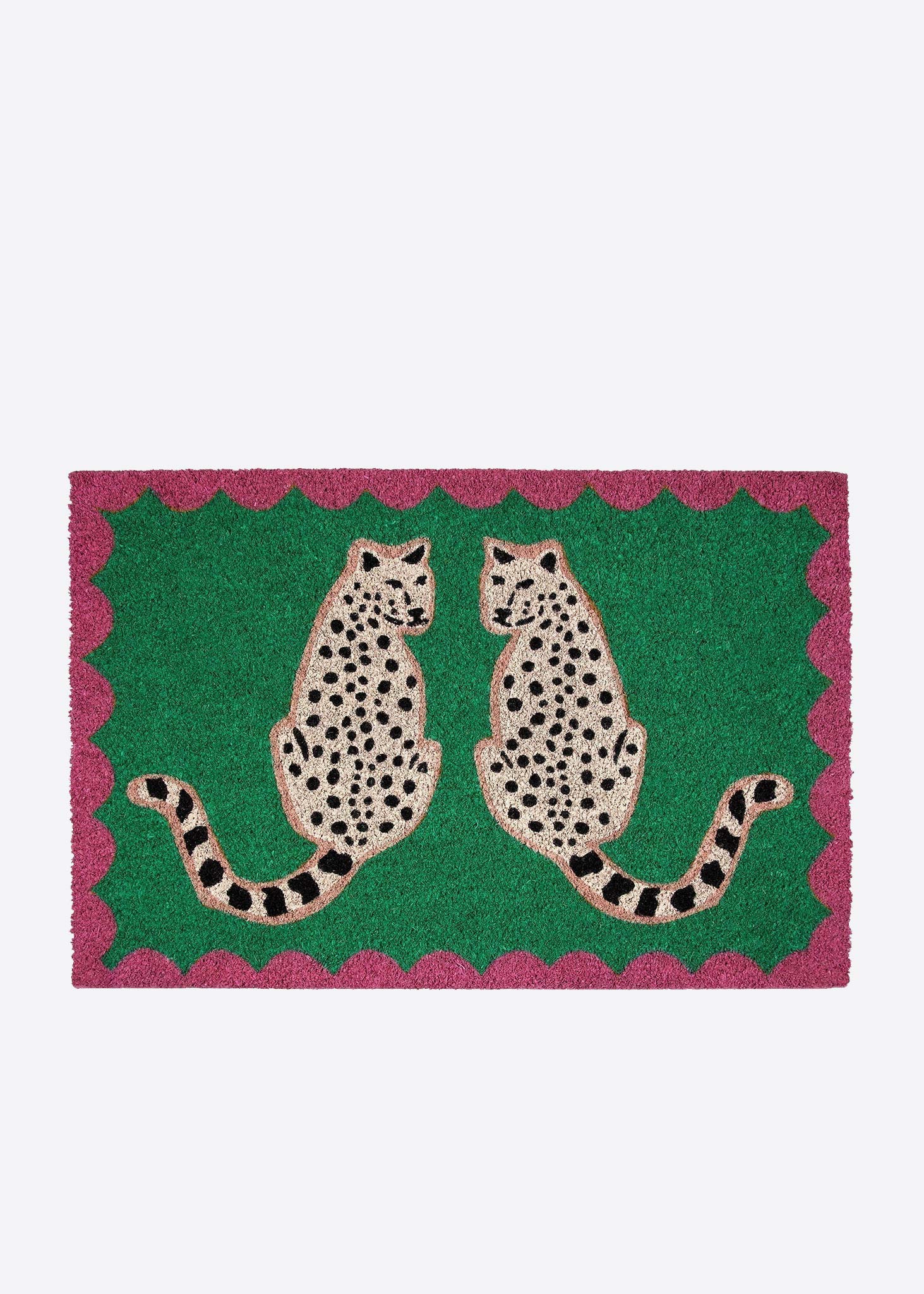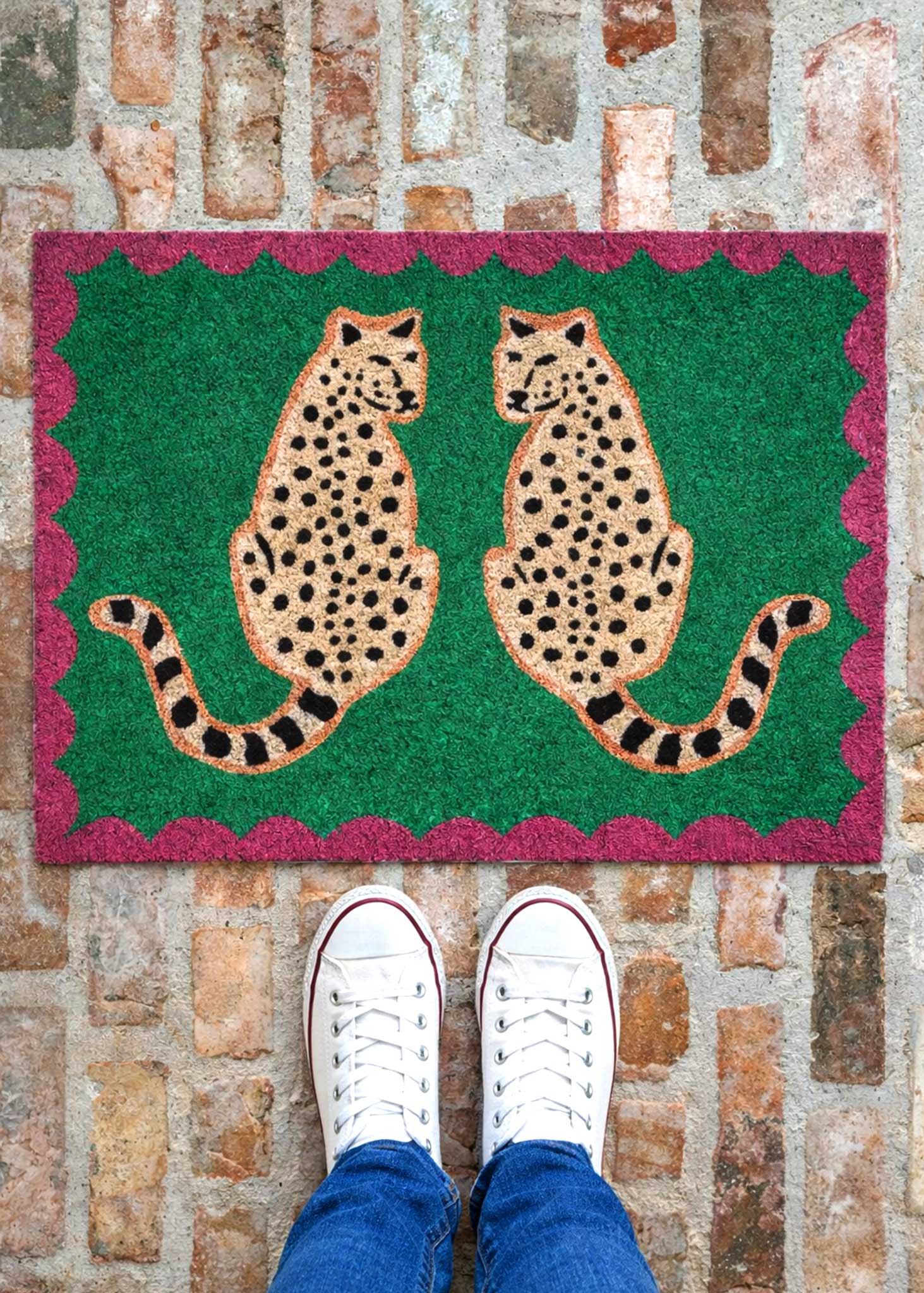 The joy of arriving home. Made even more joyful by the presence of our Snow Leopards on your doorstep. Doormats feature bold kissing leopards pattern, printed onto a feel-good green background with pink trim. Made from high quality, 100% coconut coir, our door mats have a robust PVC backing making them incredibly long-lasting.