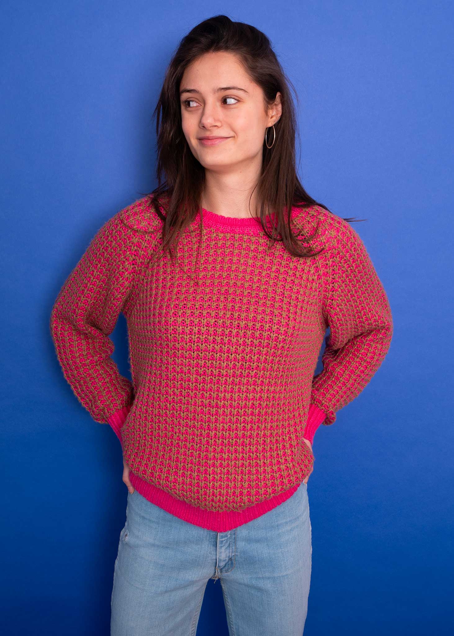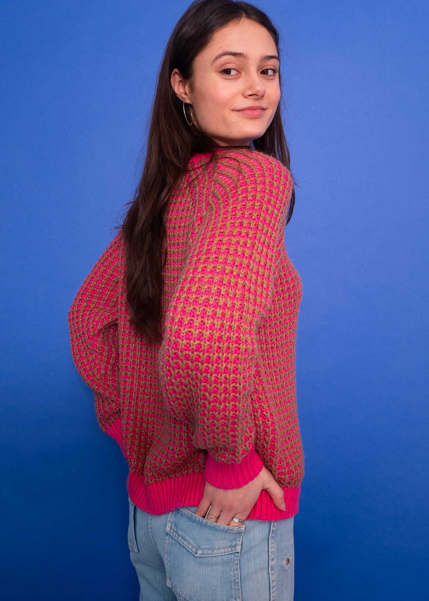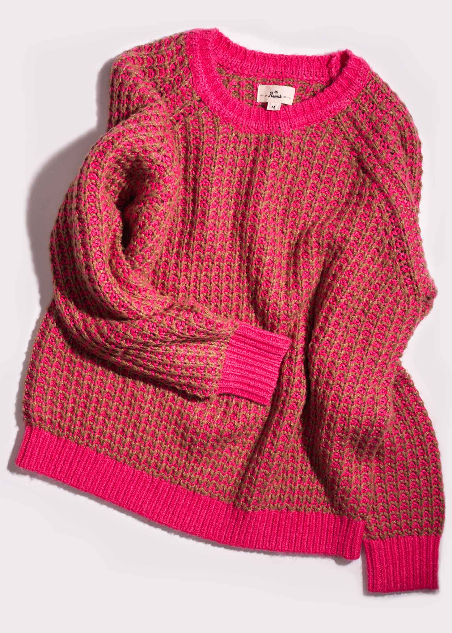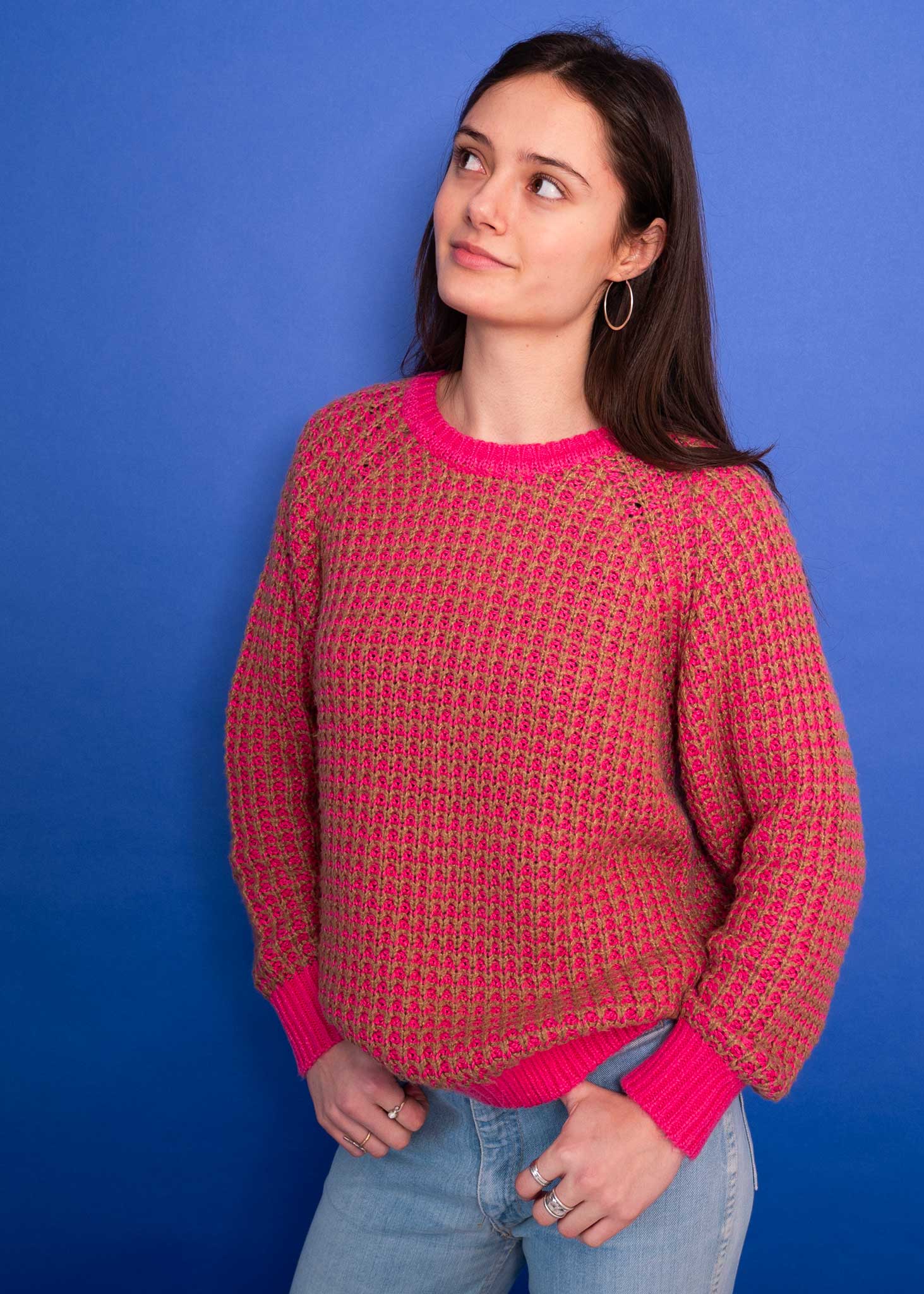 Chunky yet oh so soft, our sustainable weave jumper is machine washable and features gorgeous pink and beige contrasting stitch pattern, pink trim detailing and timeless raglan sleeve design.
