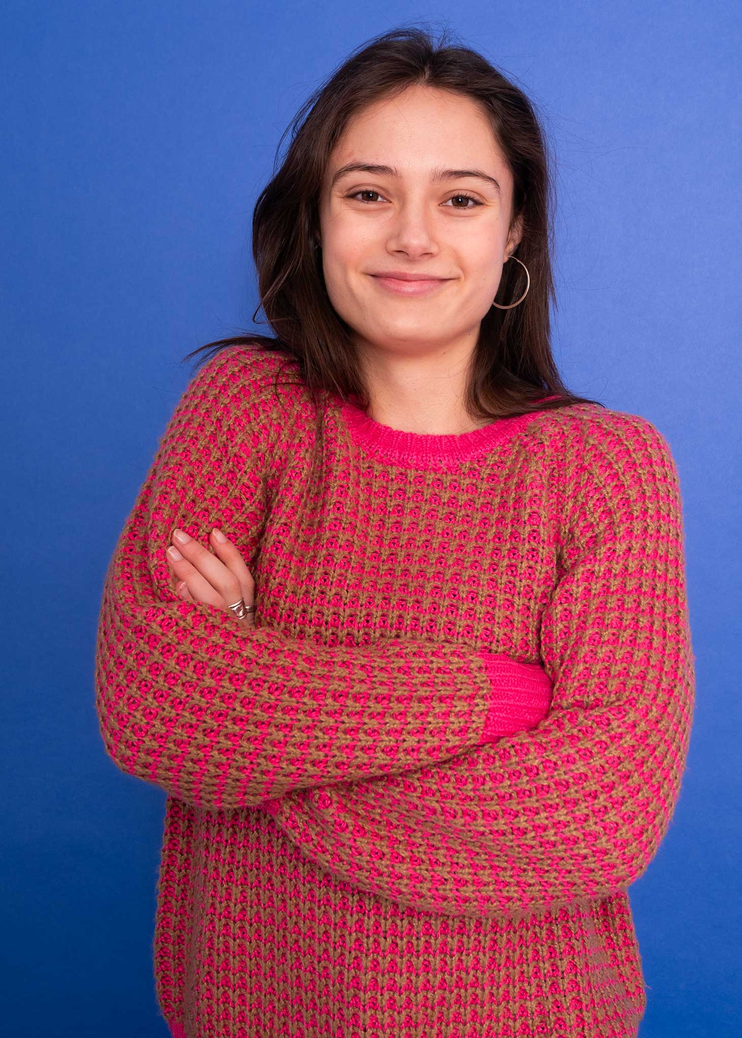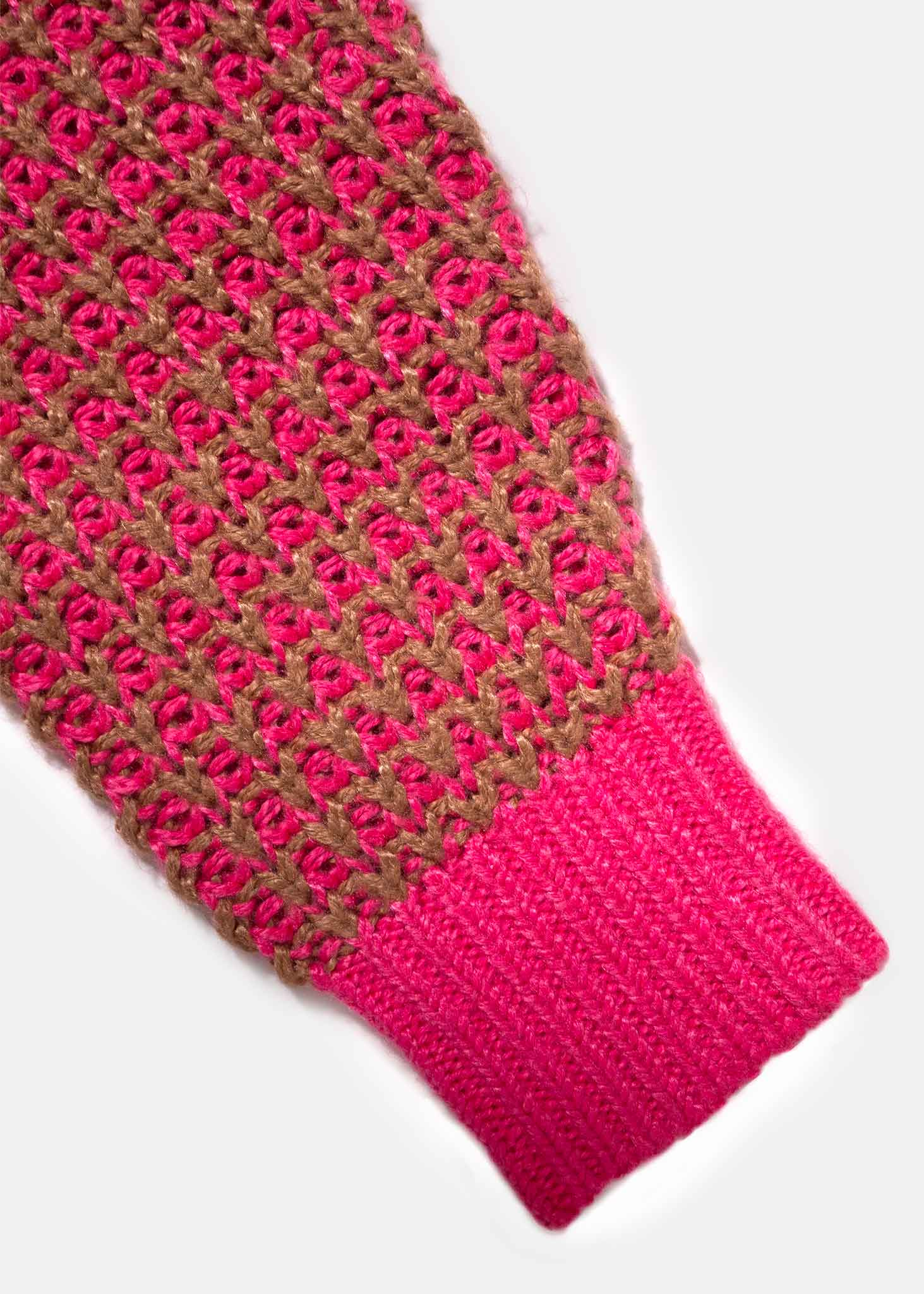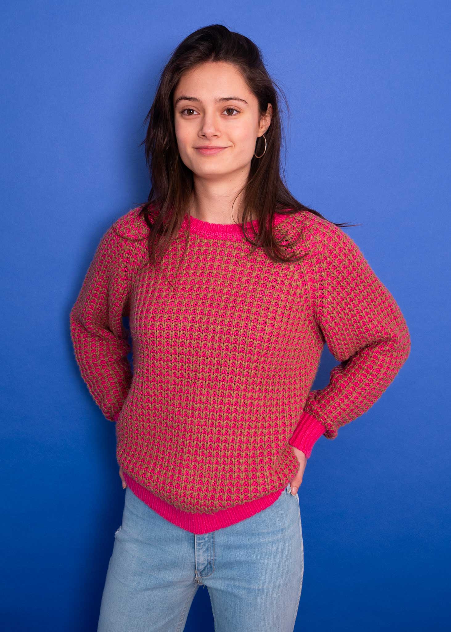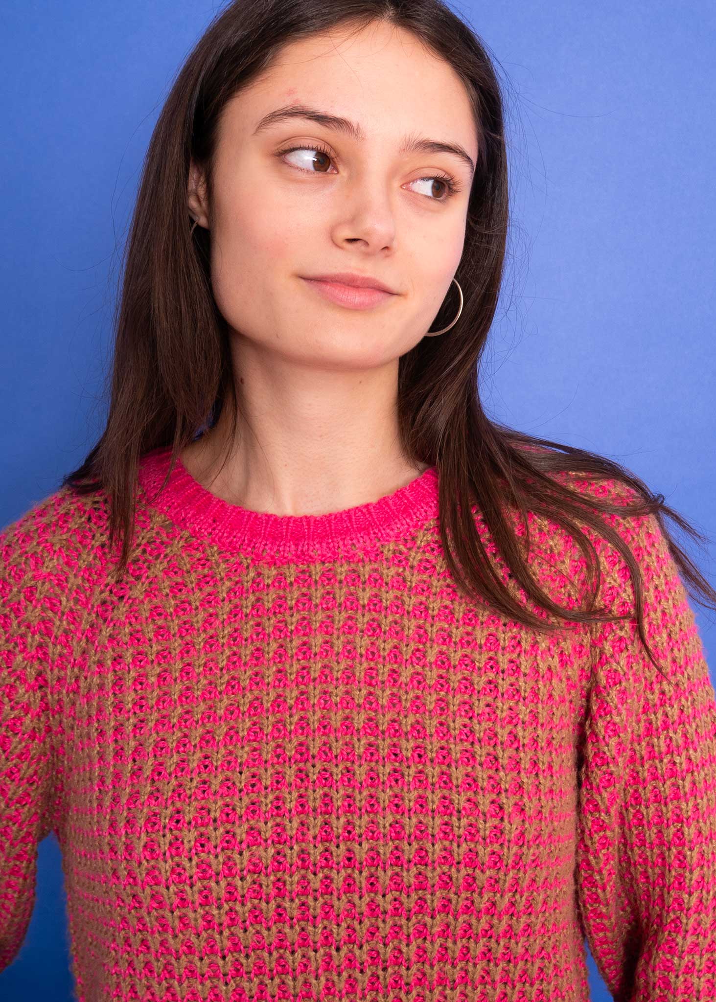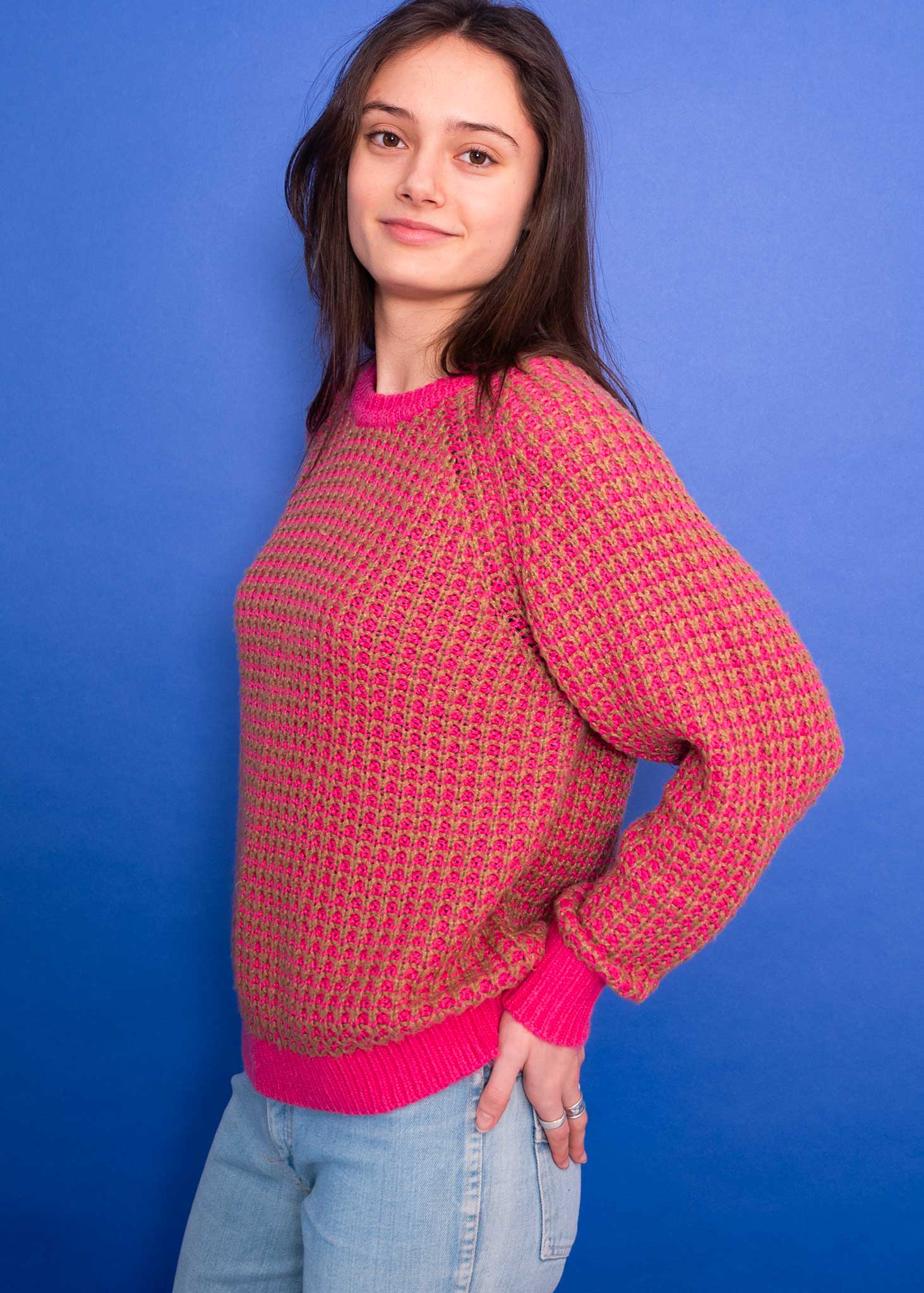 Chunky yet oh so soft, our sustainable weave jumper is machine washable and features gorgeous pink and beige contrasting stitch pattern, pink trim detailing and timeless raglan sleeve design.