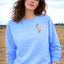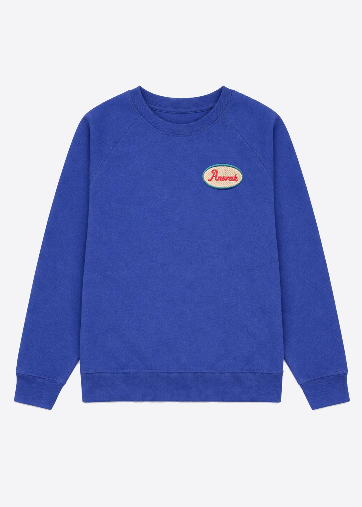 Our soft and sustainable, 100% organic cotton sweaters are perfect for everyday adventures and later-on lounging as the sun goes down. Features embroidered Anorak oval motif on an stylish blue base.