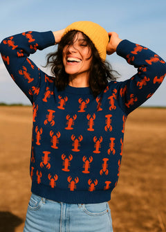 Our soft and sustainable, 100% organic cotton sweaters are perfect for everyday adventures and later-on lounging as the sun goes down. Features a super cute embroidered lobster motif on an stylish blue base.