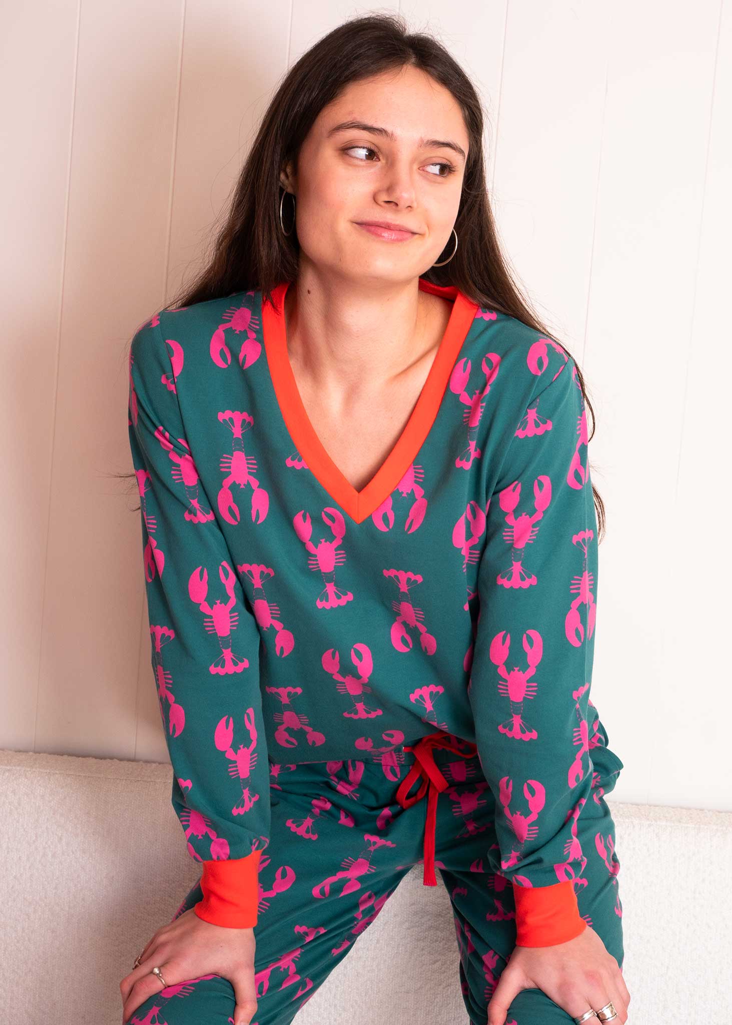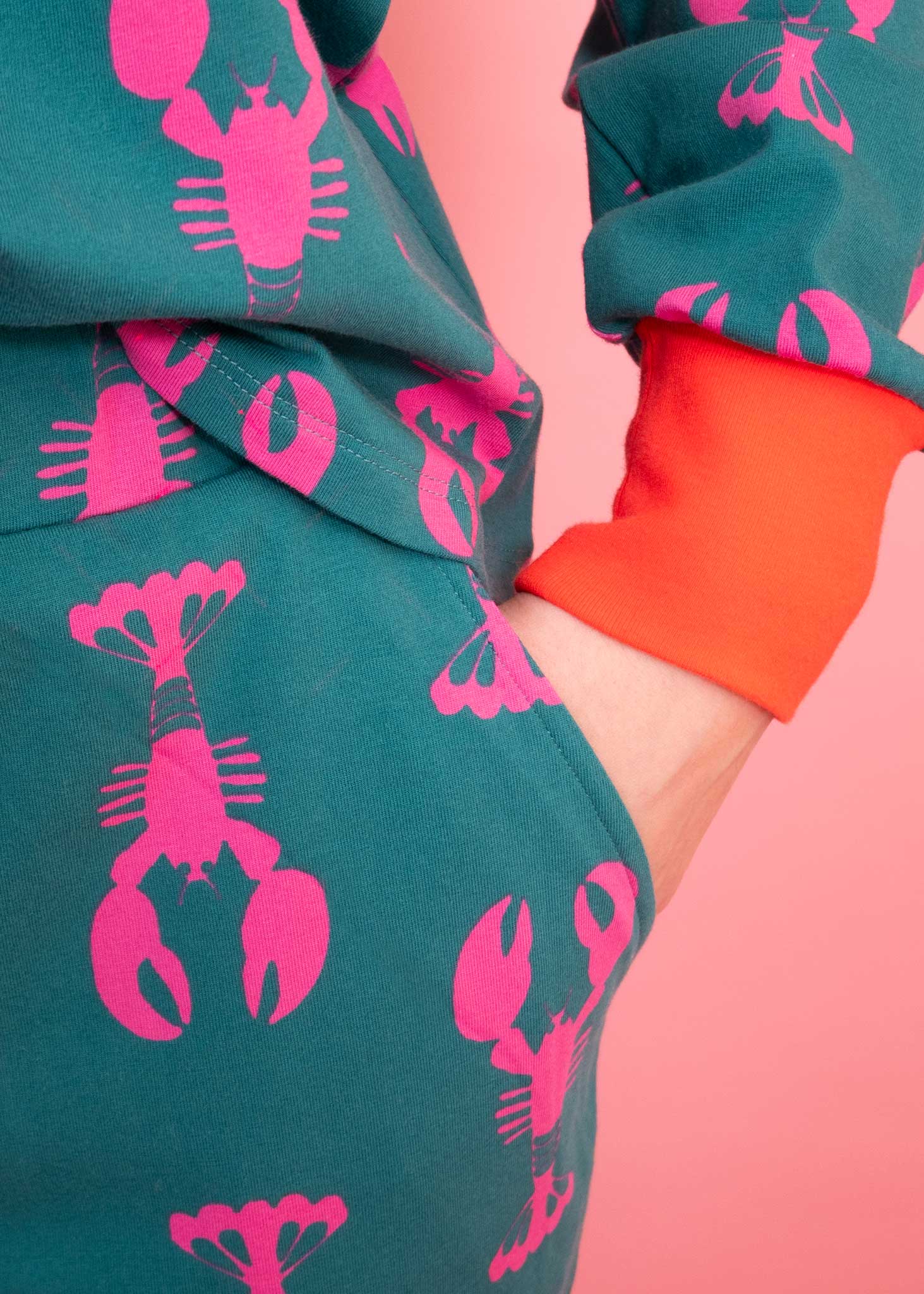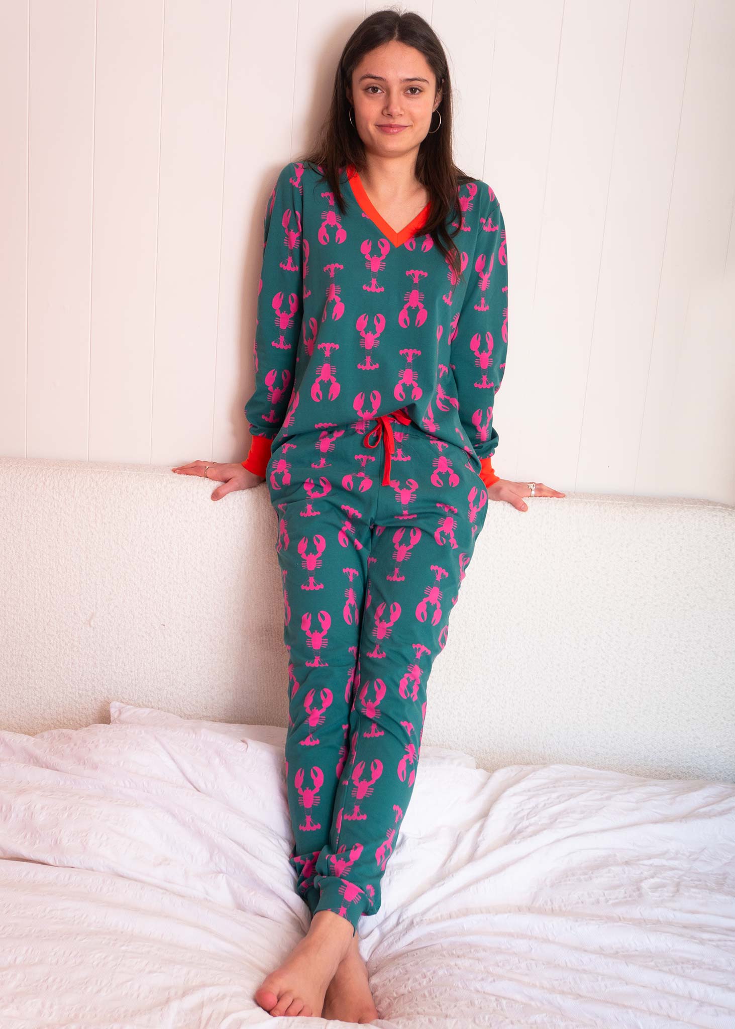 Our Lobsters jersey PJ's are perfect for both night and daytime lounging. Ethically sourced and lovingly crafted from organic cotton, they're super soft and good for the planet. Featuring stylish pink lobsters on a green ground, useful side pockets and contrasting rib detailing.
