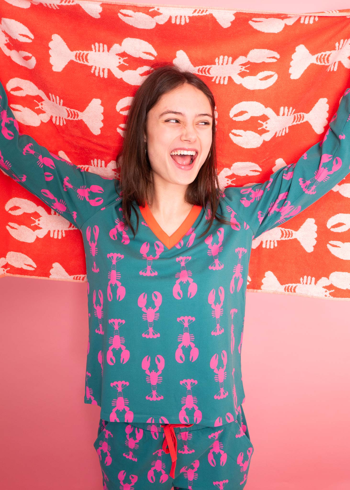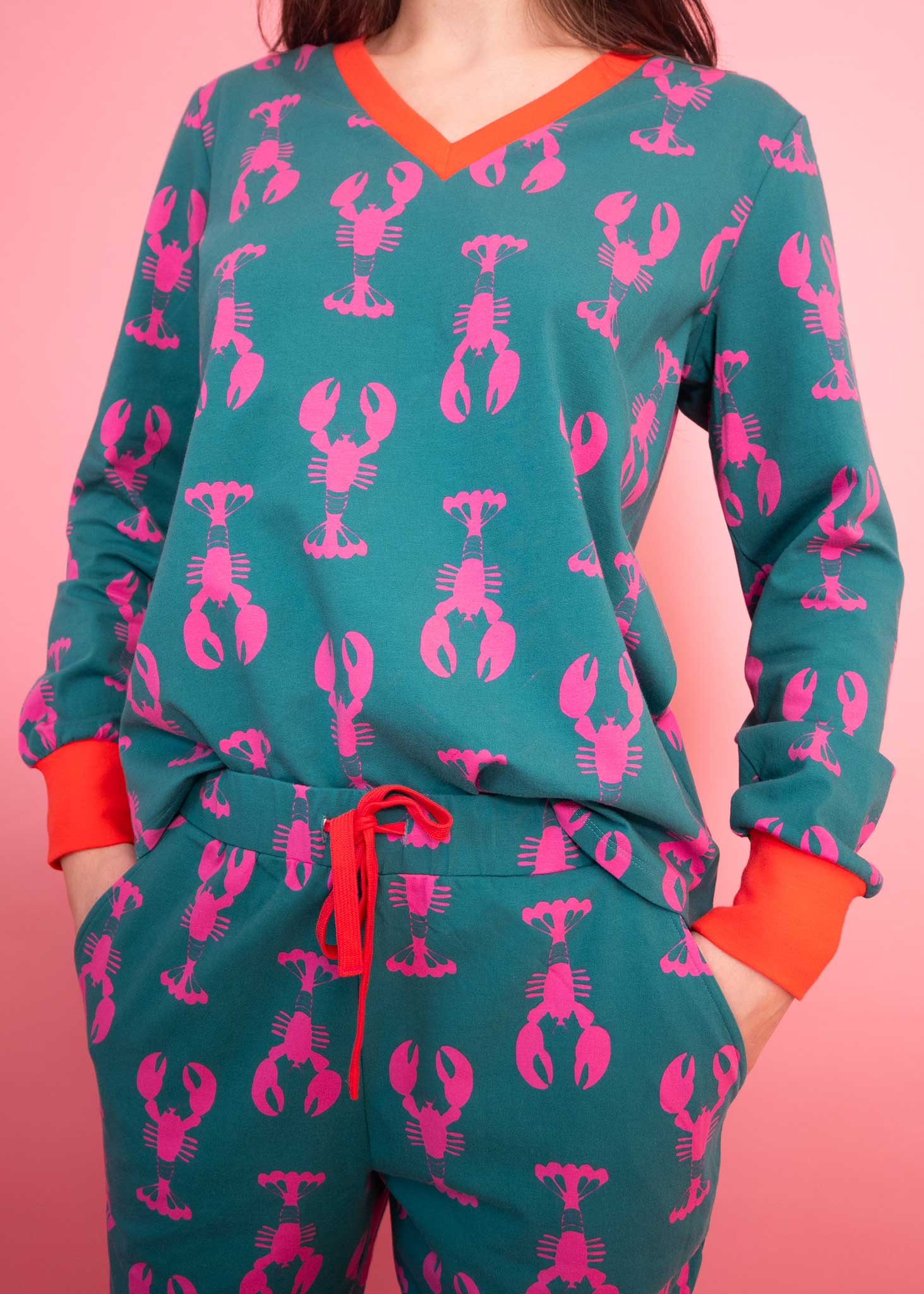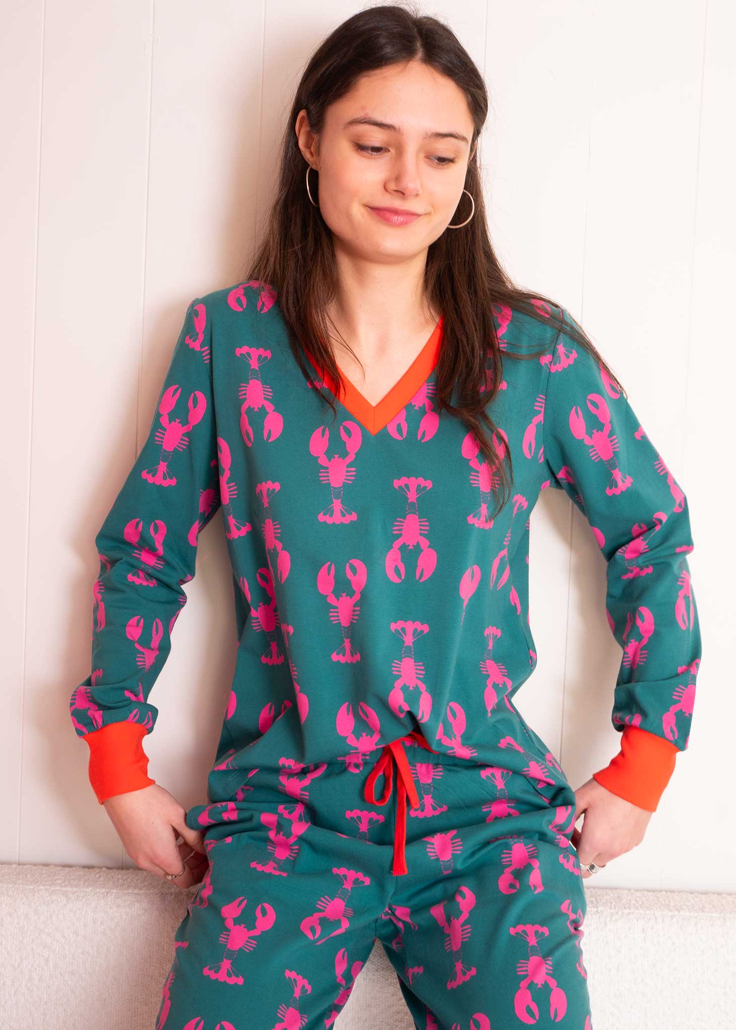 Our Lobsters jersey PJ's are perfect for both night and daytime lounging. Ethically sourced and lovingly crafted from organic cotton, they're super soft and good for the planet. Featuring stylish pink lobsters on a green ground, useful side pockets and contrasting rib detailing.