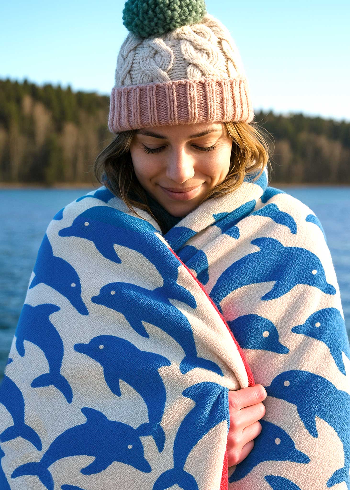 Joy in repeat. Be that long bath soaks, even longer beach days or daily wild swims in the great outdoors. Made from super soft, 100% organic cotton, the towels feature bright blue dolphin motifs on an antique white background. Available across all sizes from facecloth to bath sheet.